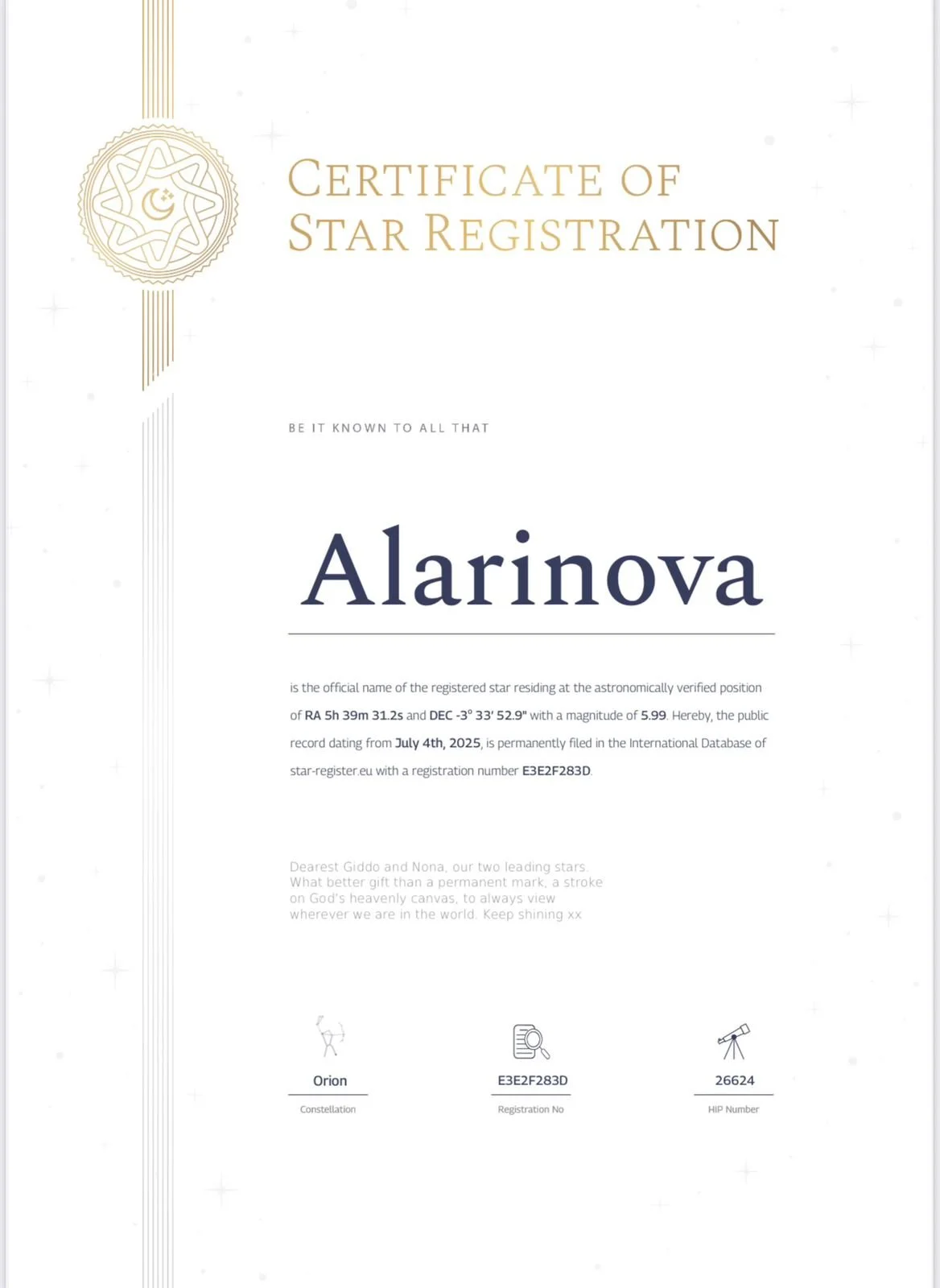 To celebrate the family business and to leave a lasting legacy for future generations, Alarinova named a star in the Orion Constellation visible with the naked eye. The Alarinova Star has its own certificate identifying its exact location.